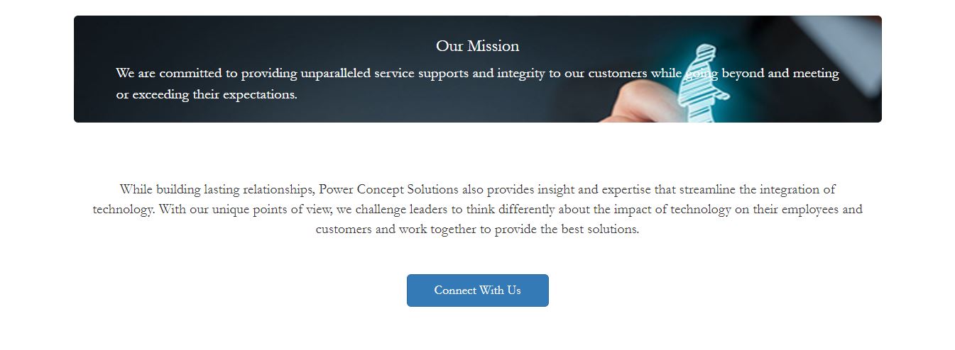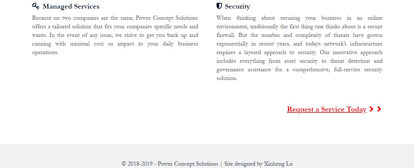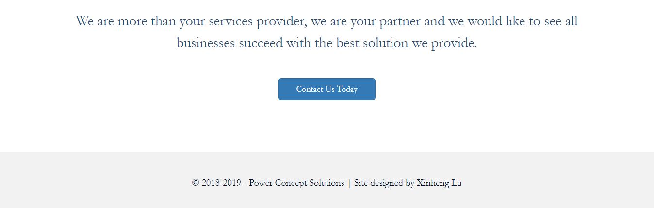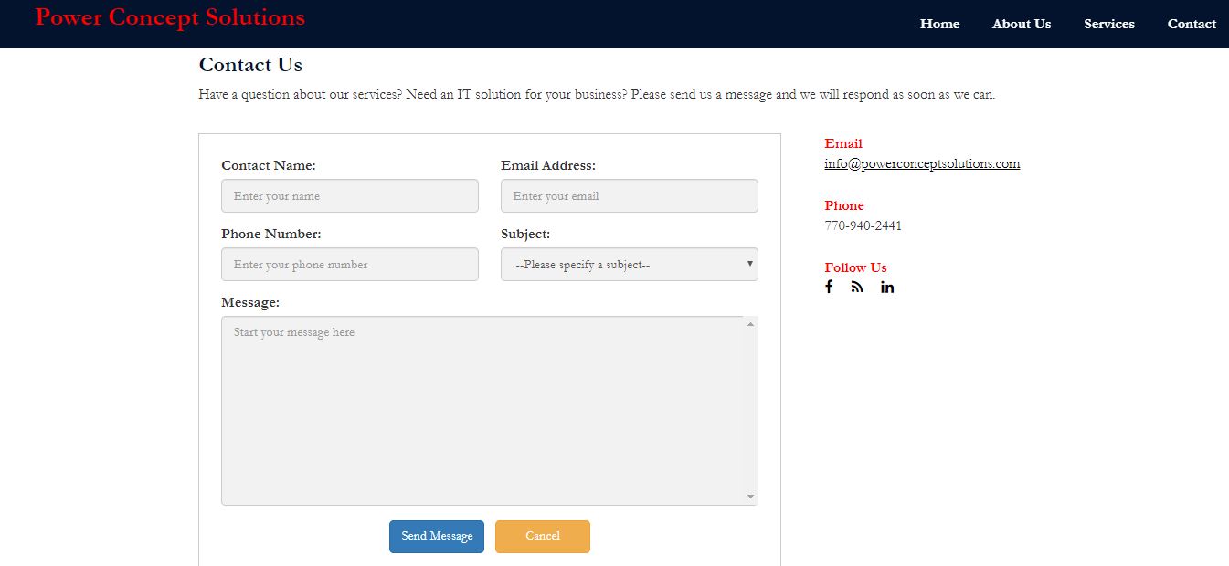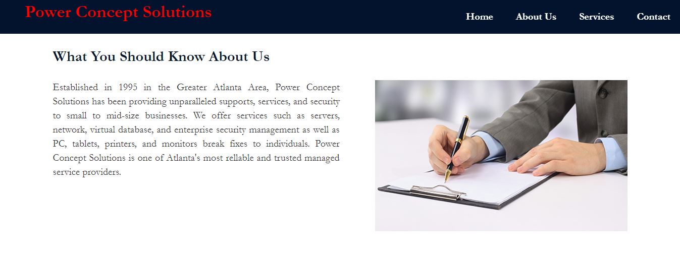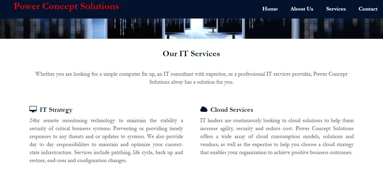 Power Concept Solutions is an IT consulting business that provides services and solutions to individuals as well as small to mid-size companies such as banks, law firms, and hospitals. I created a simple responsive website for this business from scratch in ASP.NET framework which contains a fixed top navigation bar and four web pages as shown below.